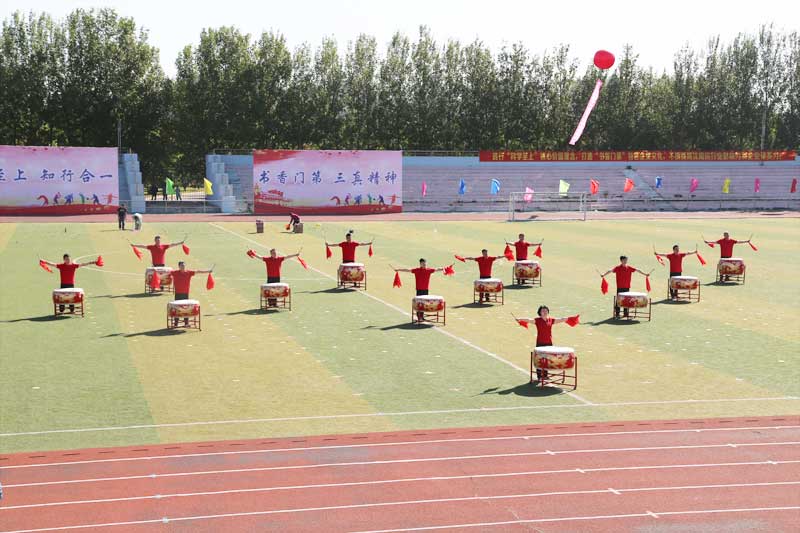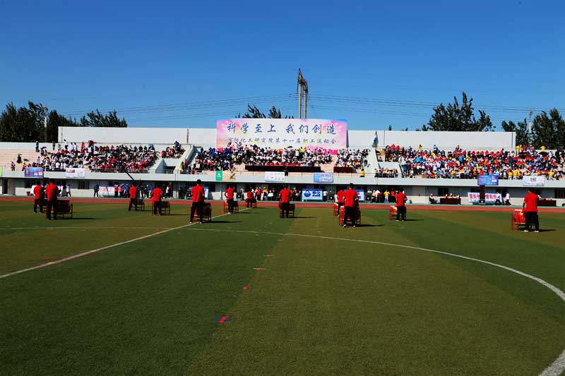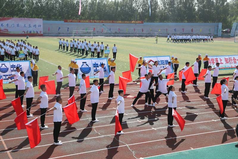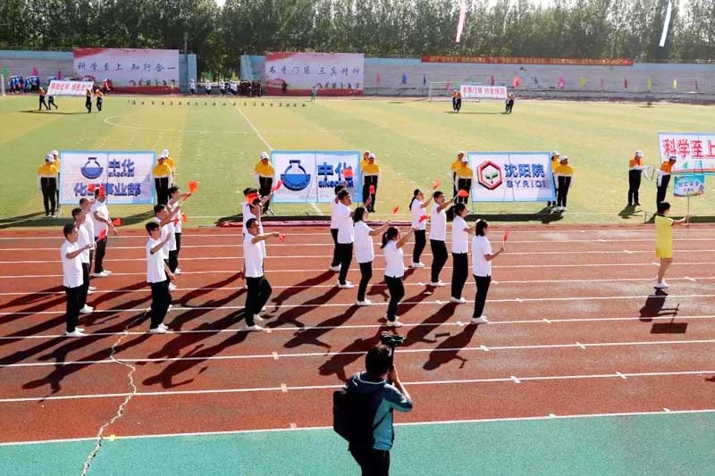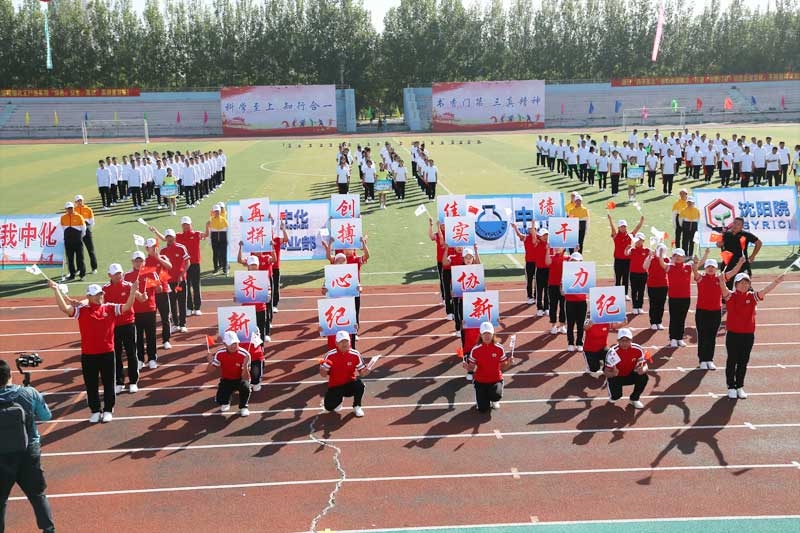 當(dāng)胥維昌院長宣布運(yùn)動會開幕后,七色彩煙在碧空中瞬間綻放,1000尾和平鴿子奮飛藍(lán)天,1000個彩色氣球把運(yùn)場場裝點(diǎn)成歡樂的海洋。10個方隊、360名方隊隊員,共同獻(xiàn)上健美操表演《干就完了》。沈陽院180名青年員工獻(xiàn)上隊形變換表演——《興化報國》,他們用手中的彩旗,拼接出沈陽院的LOGO——苯環(huán),昭示著沈陽院的科研工作蓬勃興旺,沈陽院的科研事業(yè)后繼有人。在歌曲《站起來》結(jié)束后,沈陽院13名員工獻(xiàn)上龍鼓表演——《盛世歡歌》,表達(dá)此生無悔入華夏、盛世龍騰頌歡歌的壯志豪情。