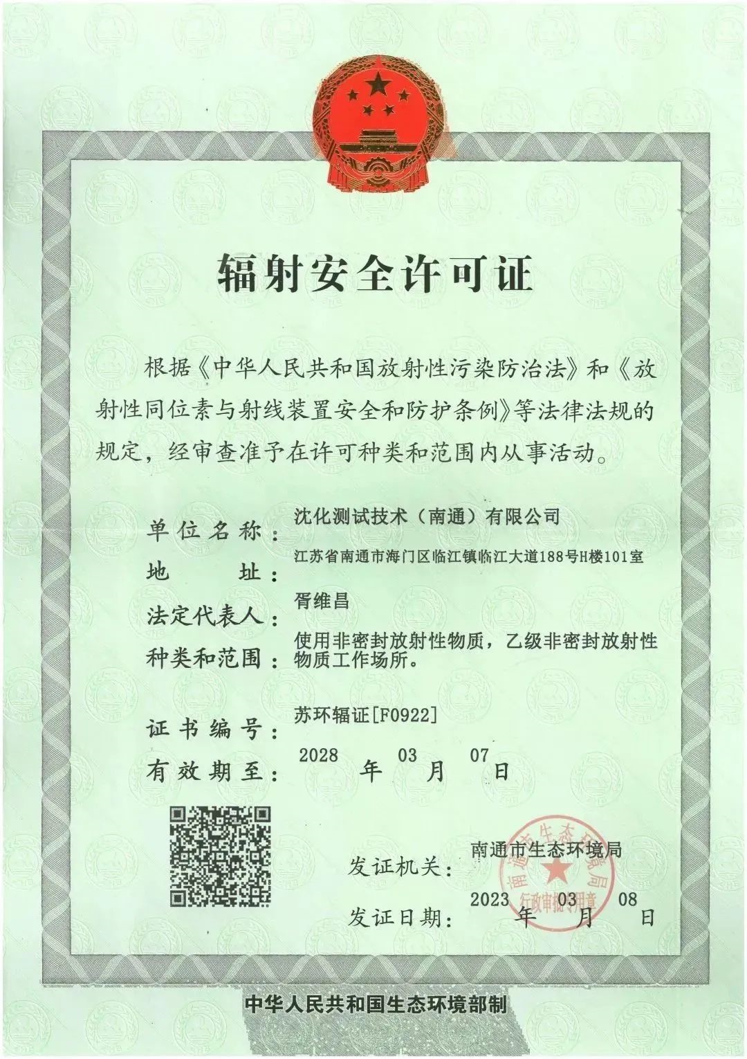 近日,沈陽院沈化測試技術(南通)有限公司獲得江蘇省南通市生態(tài)環(huán)境局許可的《輻射安全許可證》。至此,測評南通公司正式具備了利用放射性核素開展核素標記合成實驗和藥物代謝示蹤實驗的法定條件。