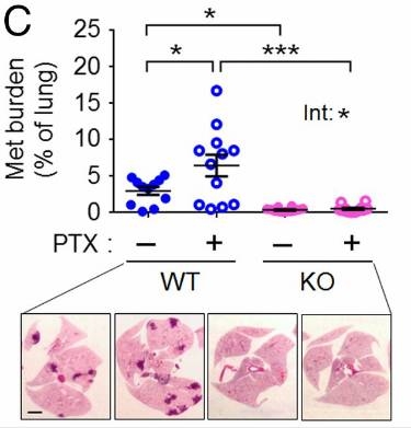 同樣,這些結(jié)果也只出現(xiàn)在野生型小鼠上。這說(shuō)明,紫杉醇的使用改變了肺組織的微環(huán)境,使癌細(xì)胞更容易在肺組織上定殖,這些影響也是通過Atf3基因?qū)崿F(xiàn)的。