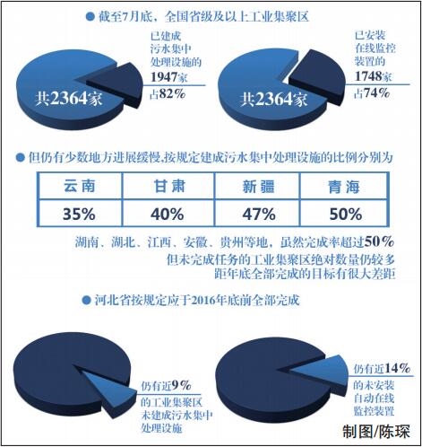 截至7月底,全國(guó)省級(jí)及以上工業(yè)集聚區(qū)共2364家,已建成污水集中處理設(shè)施的1947家,占82%;已安裝在線監(jiān)控裝置的共1748家,占74%。但仍有少數(shù)地方進(jìn)展緩慢,云南、甘肅、新疆、青海等地按規(guī)定建成污水集中處理設(shè)施的比例分別為35%、40%、47%、50%;湖南、湖北、江西、安徽、貴州等地,雖然完成率超過(guò)50%,但未完成任務(wù)的工業(yè)集聚區(qū)絕對(duì)數(shù)量仍較多,距年底全部完成的目標(biāo)有很大差距;河北省按規(guī)定應(yīng)于2016年底前全部完成,但仍有近9%的工業(yè)集聚區(qū)未建成污水集中處理設(shè)施,近14%的未安裝自動(dòng)在線監(jiān)控裝置。