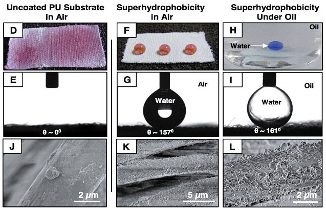 涂層修飾后的PU展現(xiàn)出優(yōu)異的空氣和油下超疏水特性。圖片來源:J. Mater. Chem. A