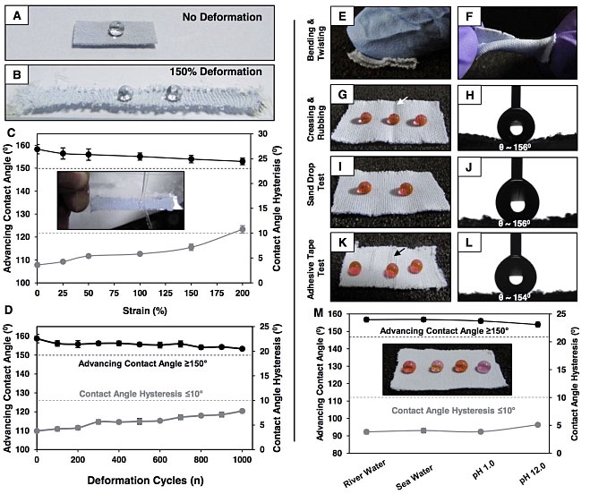 該方法制備的超疏水材料具有優(yōu)異的高形變-性能穩(wěn)定性。高達(dá)1000余次的可逆高拉伸形變測試中,在150%拉伸形變率下,材料的疏水性能基本上沒有變化;在200%形變率測試下,由于材料微觀形貌的變化其接觸角滯后略有上升。同時(shí),該超疏水材料能夠有效的承受折疊、彎曲、扭曲等形變測試,具有優(yōu)異的使用性能穩(wěn)定性。在多次可逆形變測試后,該材料在海水、淡水、酸堿等溶液的超疏性能維持不變,具有較廣的應(yīng)用范圍。