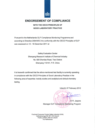 沈陽院glp評價機構(gòu)在國家相關(guān)部委、地方政府部門的大力支持下,通過了oecd成員荷蘭政府的glp國際認(rèn)證,其意義深遠。它實現(xiàn)了安全性評價試驗數(shù)據(jù)在國際上的雙邊或多邊互認(rèn),徹底解決了我國向歐盟出口化學(xué)品的安全性評價工作只能依靠國外的glp實驗室檢測的問題,將直接降低國內(nèi)同類化學(xué)品進行國際相關(guān)認(rèn)證的檢測成本,縮短其認(rèn)證的時間,進而對推動我國農(nóng)藥產(chǎn)品以自主品牌在國外取得登記出口,提高自主知識產(chǎn)權(quán)醫(yī)藥、農(nóng)藥等產(chǎn)品的價格,最終為對提高目前國內(nèi)整個醫(yī)藥、農(nóng)藥、食品、化妝品、獸藥等行業(yè)的全球銷售額有著積極推動作用。同時對實現(xiàn)我國安全評價試驗的標(biāo)準(zhǔn)化、規(guī)范化以及保障環(huán)境安全和公眾健康有著重要意義。